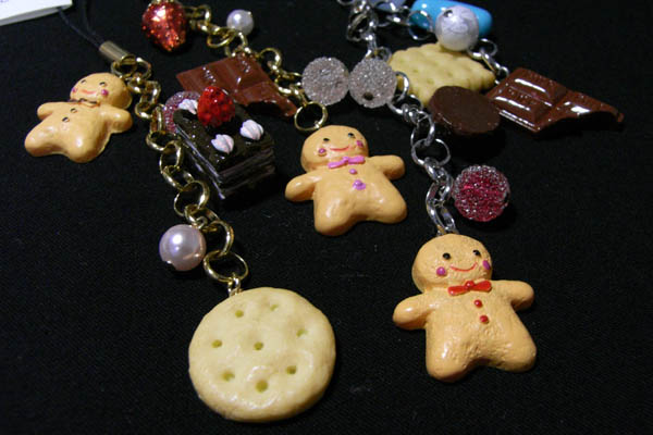チョコレートやジンジャーマンのクッキーのパーツを使ったストラップ。