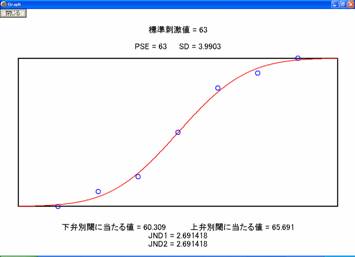 2件法による恒常法データを最尤法によって分析するプログラムPCalcJND.exeは、ここをクリックして表示されるダイアログボックスにおいて「実行」を選ぶとダウンロードされて実行される。入力用データファイルのサンプルファイルDSample63.csvは名前の箇所を右ボタン・クリックしてダウンロードすることができる。これらの入力ファイルを用いて計算すると図1のように結果が表示される。