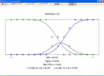 3件法による恒常法データを最尤法によって分析するプログラムPConstSt3CatSE.exeは、ここをクリックして表示されるダイアログボックスにおいて「実行」を選ぶとダウンロードされて実行される。入力用データファイルのサンプルファイルDSampleA.csvは名前の箇所を右ボタン・クリックしてダウンロードすることができる。これらの入力ファイルを用いて計算すると図1のように結果が表示される。