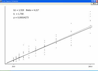 分割法(Fractionation Method)のデータからべき関数(Power Function)を求めるプログラムPFracAnal.exeは、ここをクリックして表示されるダイアログボックスにおいて「実行」を選ぶとダウンロードされて実行される。データ・ファイルのサンプルDRawData.csvは名前の箇所を右ボタン・クリックしてダウンロードすることができる。この入力データファイルを用いて計算すると図1のように結果が表示される。