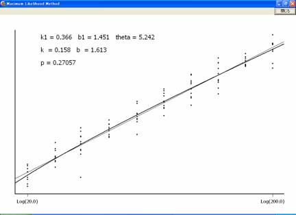 マグネチュード推定法によるデータからべき関数を求めるプログラム PMagEstLog.exeは、ここをクリックして表示されるダイアログボックスにおいて「実行」を選ぶとダウンロードされて実行される。プログラムの実行結果は、図1のように表示される。