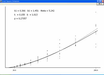 マグネチュード推定法によるデータからべき関数を求めるプログラム PMagEstLS.exeは、ここをクリックして表示されるダイアログボックスにおいて「実行」を選ぶとダウンロードされて実行される。プログラムの実行結果は、図1のように表示される。