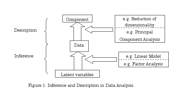 Rotation in inference from and description of data are discussed in this paper. Fig. 1 shows that data are generated by latent variables and information contained in the data is represented by components, the number of which is less than the dimensionality of the data. Both in inference and in description, we can determine the optimum spaces with respect to the data, but to identify the axes we need some criteria outside of statistics. In identifying the axes, which have substantial meanings, rotation is used. First, consider rotation in inferencec<To read the continuance, click here (pdf file)>