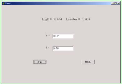 の算出のためのプログラムPCalcLogBLcenter.exeを用意しました。Windowsパソコンからこのページにアクセスしているとき、プログラム名をクリックして提示されるダイアログボックスで「開く」を選ぶと、ダウンロード後、実行されます。プログラムの使用方法はここ(PDFファイル)をクリックすると表示されます。プログラムのソースコードは自己解凍型圧縮ファイルCalcLogBLcenterFiles.EXEにまとめてあります。ファイル名をクリックしてダウンロードで保存した後、実行して解凍するとフォルダCalcLogBLcenterFilesが作成されて、解凍したプログラムのソースファイルが格納されます。プログラムはDelphi 6 Professionalで作成されています。