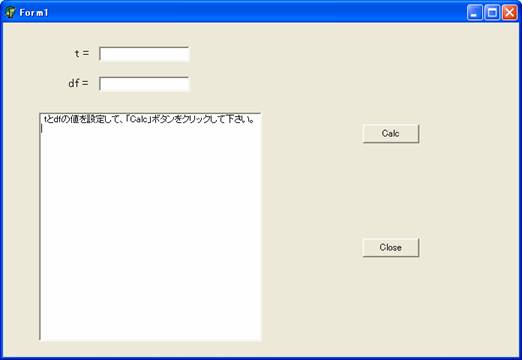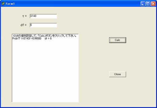 エディットコンポーネントにtとdfの値を設定して「Calc」ボタンをクリックすると計算結果がメモ・コンポーネントに表示されます。下図はtの値として3.143、dfの値として6を設定したときの結果です。