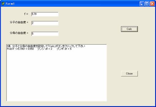 エディットコンポーネントにfと分子と分母自由度の値を設定して「Calc」ボタンをクリックすると計算結果がメモ・コンポーネントに表示されます。下図はfの値として5.79、分子の自由度として2、分母の自由度として5を設定したときの結果です。