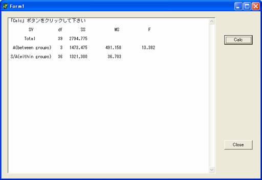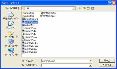 プログラムの実行前に用意しておいた入力データファイルの名前をファイル名のところに設定します。上図ではDANOVA.DATが設定されています。ファイル名の設定後「開く」ボタンをクリックすると下図のように結果が表示されます。