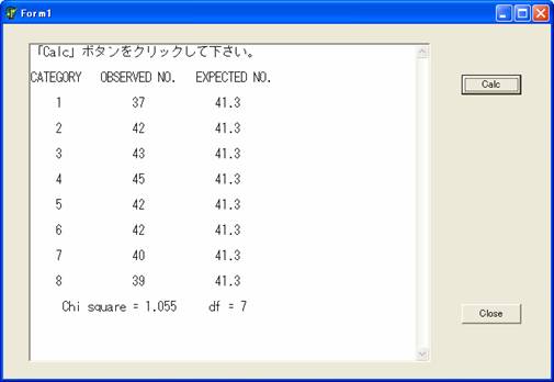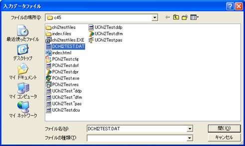 プログラムの実行前に用意しておいた入力データファイルの名前をファイル名のところに設定します。上図ではDCHI2TEST.DATが設定されています。ファイル名の設定後「開く」ボタンをクリックすると下図のように結果が表示されます。