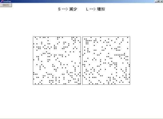 のように2つのドットパターンが表示され、Sキー、あるいはLキーを押すことによって右側のドットパターンのドット数の増減を行い、右側のドット数の感じが左側の感じの半分になるように調整します。ドット数が半分というのは、客観的に半分というのではなく、見た感じで半分ということです。この「半分の感覚」というデータから感覚尺度がべき関数として求められ、下図のように表示されます。