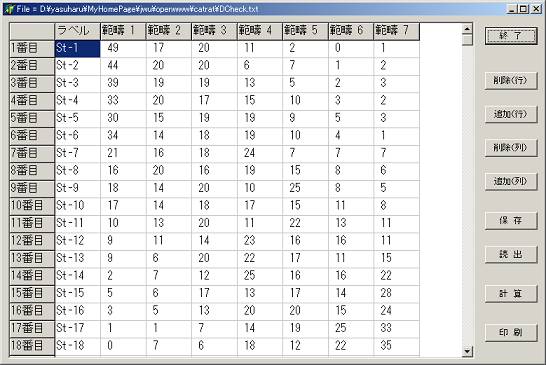 N個の刺激のkカテゴリーによる評定によって得られてたデータに対して、データの相対頻度と理論値との差の2乗和を最小にするという基準でカテゴリ境界の値と刺激値を求める方法に従ってプログラムPCatRat.dprを作成しました。プログラムPCatRat.dprでは相対頻度の変換を行わないので、頻度が0であってもデータとして採用できます。データは次のように表の形式のセルに設定します。