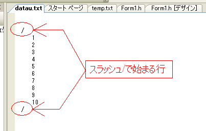 行の先頭がスラッシュ/で始まる行に挟まれて、データが1行に1つずつ書かれている。データの読み込みのときは、このスラッシュ/で始まる行まで読み飛ばし、次のスラッシュ/で始まる行までデータを各行から1つずつ読み込んでいく。