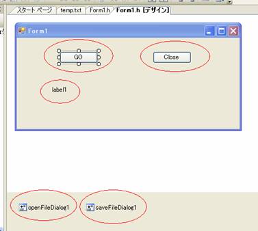 フォームのデザインは、Buttonを2個、Labelを1個、図4のように配置する。さらにOpenFileDialogとSaveFileDialogを用意する。