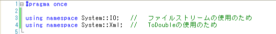 ファイルストリームを用いるために名前空間System::IO、文字列をその表す実数値に変換する関数ToDoubleを用いるために名前空間System::Xmlの使用を宣言しておく(図5)。