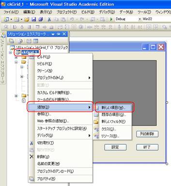 プログラミング時に子フォームを追加するときは、ソリューションエクスプローラにおいてソリューション名の下のプロジェクト名をマウスの右ボタンクリックで表示されるメニュにおいて「追加|新しい項目」を選ぶ(図4)。