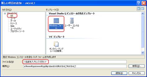 カテゴリ「UI」、テンプレート「Windowsフォーム」を選び、ファイル名を適当に設定して「追加」ボタンをクリックすると子フォームが追加される。子フォームと親フォームとの間でデータをやり取りするためにファイルmyIntFc.hを図6のように用意している。