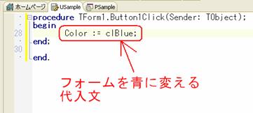 手続きButton1Clickの実行部に、フォームの色を青に変える文「Color := clBlue;」を書き加える(図12)。