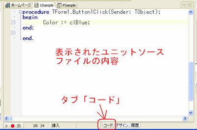 ユニットファイルを表示しようとしてユニットファイル名(図B3ではUSample)をクリックしたときに、ユニットと組み合わされているフォームが表示されたときは(図B4)、画面下のタブ「コード」をクリックする。