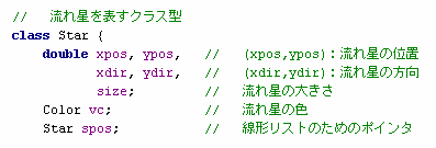 ポインタによるリストの表現は、Javaにおけるクラス型がポインタであることを利用して行うことができる。流れ星のアニメーション・プログラムをポインタによるリスト表現の例として作成した。アニメーションの速さを制御するためにスレッドのsleepメソッドを用いた。流れ星は図1のように画面に表示される。