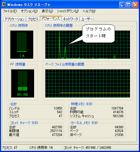 画面からはみ出した星は線形リストからはずされるが、このはずされた星のオブジェクトはJavaにより自動的に削除される。アニメーションの速さはsleepメソッドによって制御されているので、無限ループの実行中もCPUの使用率は高くない。これらのことは図5のタスクマネージャのパフォーマンスの表示によって確認することができる。