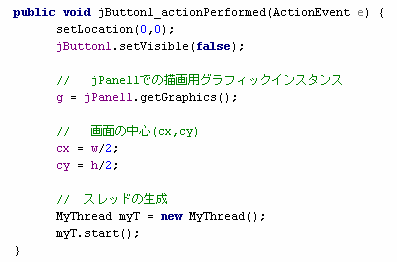 図6のメソッドでは、パネルjPanel1上での描画用グラフィックオブジェクトをグローバル変数gに設定してから星の運動を表すアニメーション用のスレッドMyThreadを生成・実行している。このスレッドのsleepメソッドにより運動の速さが制御されている。
