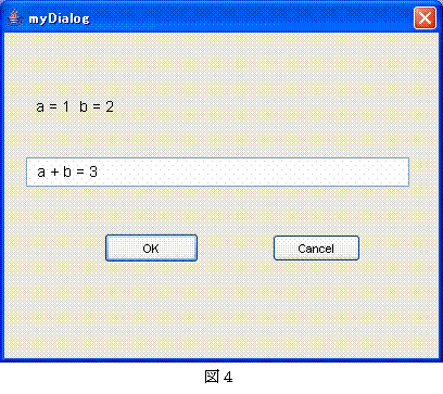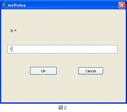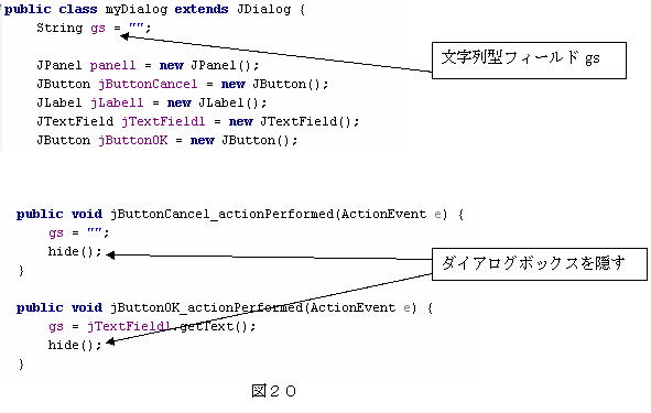 2つのボタン、OKとCancel、はいずれもhideメソッドによってダイアログボックスを隠すものであるが、文字列型フィールドgsへの文字列の設定が異なっている。