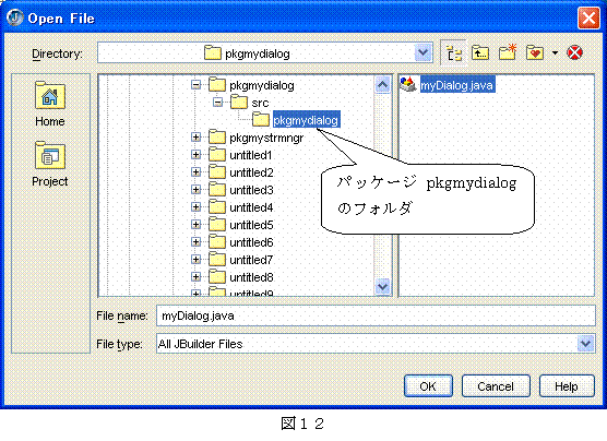 上のパッケージ作成用のプロジェクトのパッケージの作成終了後のファイルを圧縮ファイルckMyDialog.ZIPとしてまとめた。ckMyDialog.ZIPはここをクリックしてダウンロードできる。ダウンロードして解凍すると作成されるフォルダckMyDialogにあるプロジェクトファイルckMyDialog.jpxをダブルクリックなどによりJBuilderで開くと実行することができる。