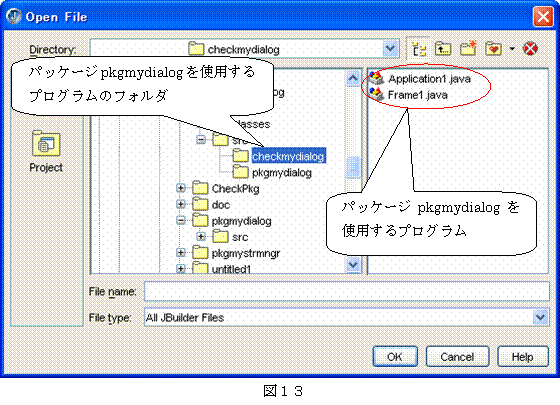 用意したダイアログボックスの設計とプログラミングは実際に他のプログラムからダイアログボックスを呼び出しながら行うので、まず上で用意した雛形のまま、ダイアログボックスのチェックを行うプログラムからimportできるようにコピーする。このときプログラムのフォルダ(図13ではcheckmydialog)とパッケージのフォルダ(図13ではpkgmydialog)との関係は図13に示すように設定する。