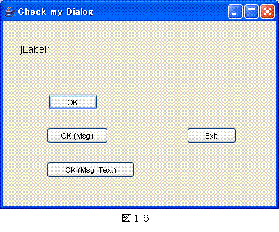 実際に上の手順でダイアログボックスクラスの作成に用いたプロジェクトがckMyDialogである。このプロジェクトを実行すると図16のフレームが表示される。