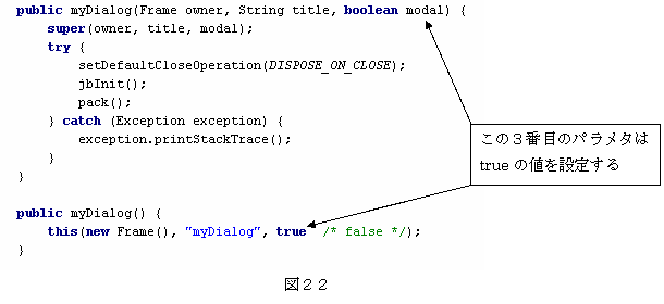 なお、ダイアログボックスのオブジェクト(インスタンス)を生成するコンストラクタは、パラメタmodalの値をtrueに設定して呼び出す。この値がtrueであれば、showメソッドでダイアログボックスを表示したとき、hideメソッドでダイアログボックスを隠すまで、ダイアログボックスを呼び出したプログラムにおける実行はshowメソッドの実行箇所で止まっている。