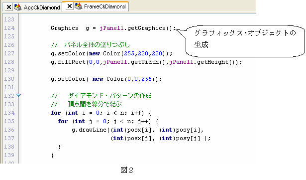 図1の場合、フレーム上のパネル(jPanel1)に描画を行っている。そのため、図2に示すように、描画を行うパネルのメソッドgetGraphicsによってグラフィックス描画のためのオブジェクト(Graphicsクラス)を生成してGraphics型変数gで表している。