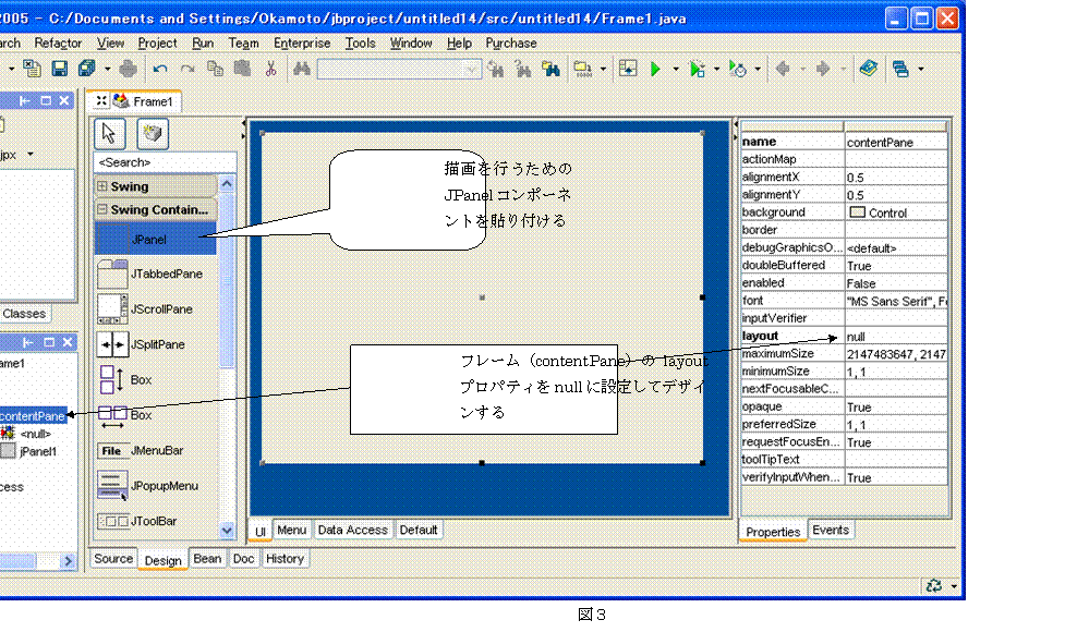 描画を行うパネル(JPanelコンポーネント)はSwing Containersに用意されている(図3)。フレーム(contentPane)のlayoutプロパティをnullに設定してからJPanelコンポーネントをフレーム上に貼り付ける。