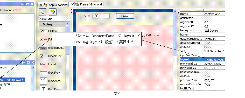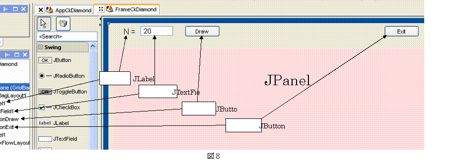 ダイアモンド・パターンの頂点の数を設定するためのテキストフィールドと描画開始のためのボタンを貼り付ける(図8)。