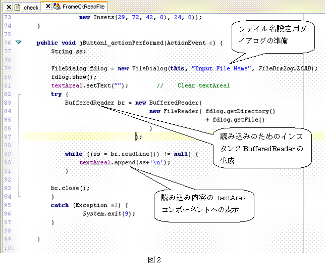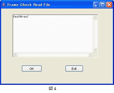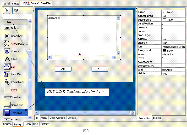 図2のプログラムの設計時のフレームは図3のようになっている。読み込んだテキストの内容を表示するコンポーネントtextAreaはAWTに用意されているものである。