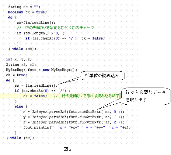 図2のプログラムでは、文字列型変数ssに読み込んだ文字列データからメソッドsubStrExtrによって必要なデータを取り出している。メソッドsubStrExtrは次の形で用いる。