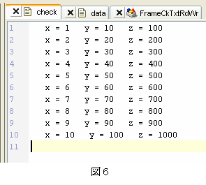 書き出し用テキストファイルの名前を設定して「保存」ボタンをクリックすると、図4で設定したファイルからデータが読み込まれて、その値が図5で設定したファイルに書き出される。すべてのデータの処理が終了するとプログラムの実行は終了する。図1の入力データに対する出力ファイルの内容は図6のようになっている。