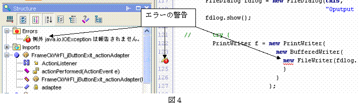 ファイルの書き出し処理の部分をtry文で囲まないと例外に対する処理が記述されていないというエラーが表示される(図4)。