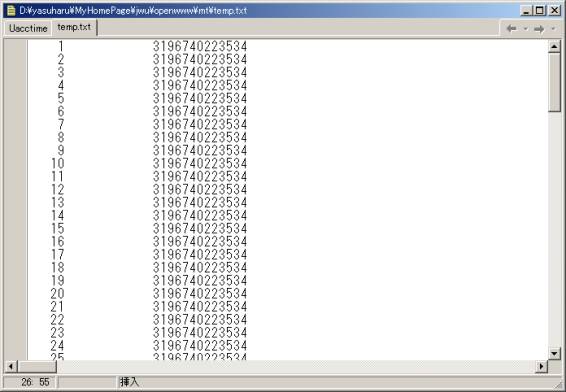 ファイル名の設定後、「開く」ボタンをクリックするとデータが書き出されてプログラムの実行終了となります。データはテキストファイルとして書き出されるので、プログラムの実行終了後エディタで開いて見ることができます。