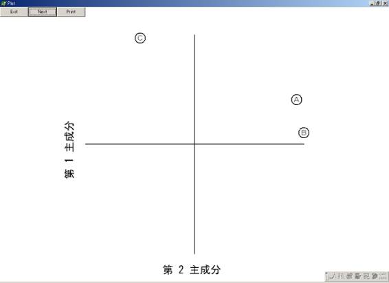 データが多くの変数からなるとき、それらの変数の間に何らかの関係があれば、データ全体の情報をより少ない変数で表せる可能性があります。そのための方法の1つとして主成分分析があります。主成分分析を行うプログラムとしてPPCA1.dprを用意しました。このプログラムでは分析結果を次図のように図示することもできます。