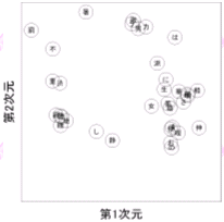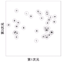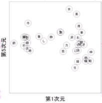 5グループに分かれていると判断した。多次元尺度法(MDS, Multidimesional Scaling)による分析では形容詞の布置は5次元空間で求めるのが適当であると判断された。得られた布置を以下に示す。