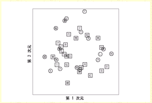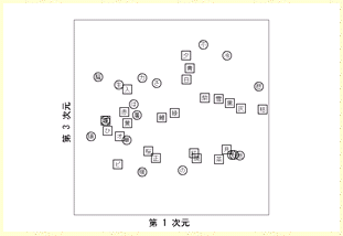データは、沖縄とそれ以外に分けて分析しました。3次元解は以下のようになりました。画像をクリックすると大きい図が表示されます。