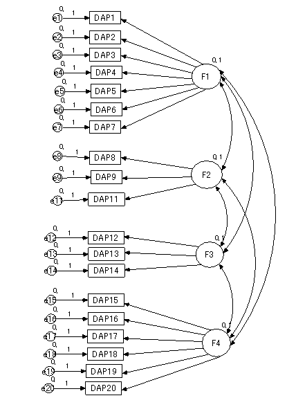 以上の結果を踏まえて、項目dat10を除いて、河合ら(1996)および堀(2001)で説明されている因子構造が認められるかどうかを確認的因子分析法によって調べることにする。まず、Amos 5 によって、文献に示されている因子構造を下図のパス図で表した。